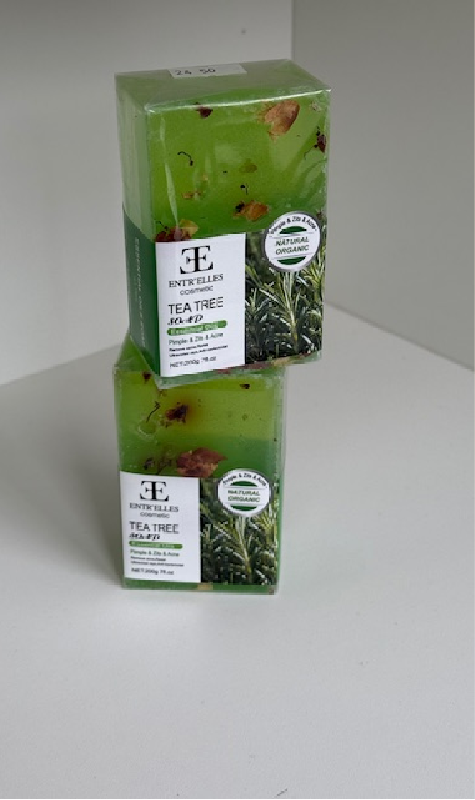 FR: Savon naturel purifiant aux huiles essentielles de Tea Tree. Idéal pour les peaux à tendance acnéique, il nettoie en profondeur et aide à prévenir les boutons.EN: Natural purifying soap with Tea Tree essential oils. Ideal for acne-prone skin, deeply cleanses and helps prevent pimples.